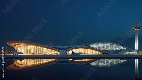 Orly Airport illuminated at night. Shining airport complex with elegant night illumination.