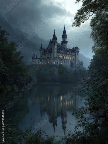 a large ornate castle or palace surrounded by a moat and dense forest in a dark moody atmosphere