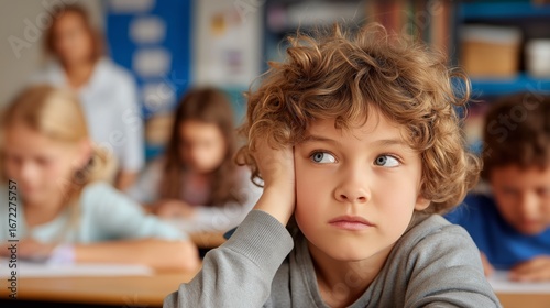Classroom scene where ADHD child is visibly distracted while other children focus, teacher in background.