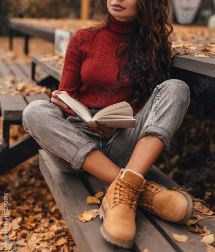 Beautiful woman in cozy sweater reading book while sitting on wooden bench in autumn park. Spending time alone and enjoying reading literature. A female student studying with a textbook on nature.