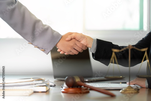 Legal Consultation. Business handshake between lawyer and client in modern office.
