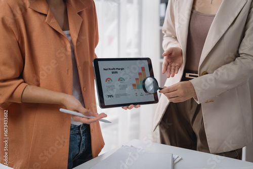 Two businesswomen analyzing financial charts on a digital tablet, using a magnifying glass to discuss growth and profit margins in a collaborative office setting