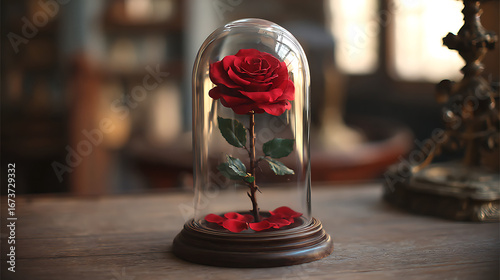 A red rose preserved inside a glass dome, symbolizing timeless beauty and eternal love.