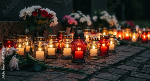 Glowing Memorial Candles with Flowers – Spiritual Remembrance for All Souls’ Day and All Saints’ Day