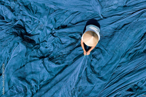 Men in Vietnamese hats weave blue fishing nets aerial top view above, life in a fishing village in the depths of Vietnam on the ocean coast. Culture traditions authentic lifestyle
