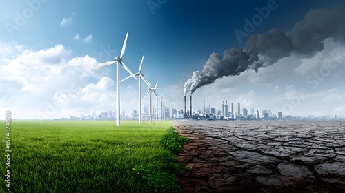Concept of climate change: A split landscape showing clean energy with wind turbines vs a polluting factory. Environmental choice and global warming.