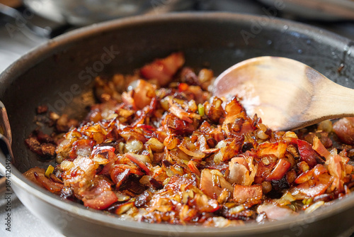 Bacon and caramelized onion cook slowly in a pan, stirred with a wooden ladle in a traditional kitchen. A rustic preparation that evokes home-cooked meals and authentic Mediterranean flavors.