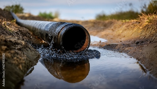 oil spill a close up of a black oil pipe leaking viscous dark liquid onto the ground the spill creates a pool of contaminated oil