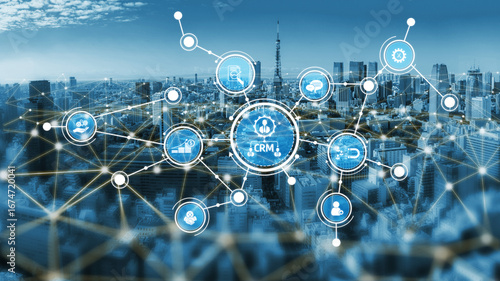 A striking city skyline representing the intersection of technology and urban life, featuring a digital network overlay that highlights CRM functionalities and connections. Tessel