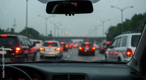 Traffic Jam Seen Through a Car Windshield on a Rainy Day