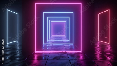 A captivating tunnel environment features glowing polygon cubes framed by vibrant neon lights. The floor reflects the luminous hues, creating an otherworldly atmosphere
