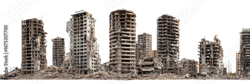 A city skyline with many buildings in ruins