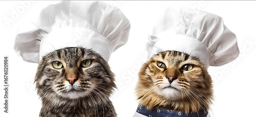 Two cats wearing chefs hats and aprons isolated on a white background Real photograph