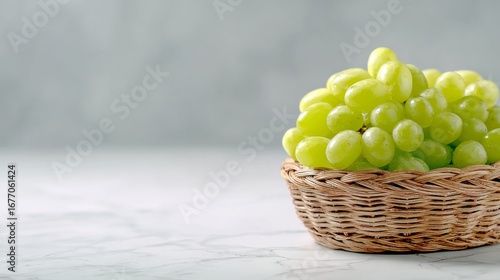 The soft texture and shadows of green grapes are visible as they overflow from a basket and spill onto a light-colored countertop