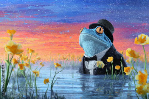 A dapper frog in formal wear stands in tranquil waters, surrounded by vibrant flowers under a colorful sunset sky.