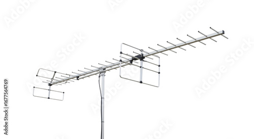 UHF Television antenna on isolated white backdrop captures signal transmissions from different broadcasting locations accurately