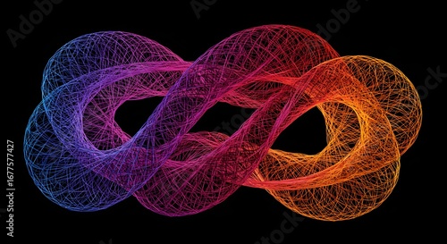 Abstract colorful wireframe infinity symbol on a black background. Eternity, data flow, and complexity concept. 3D render of a futuristic mobius strip representing perpetual processes.