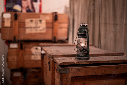 Stara lampa naftowa na drewnianej skrzyni w magazynie