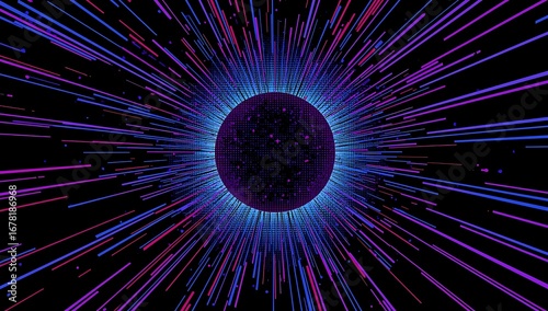 Abstract, glowing, blue lines radiating from a central, black circle
