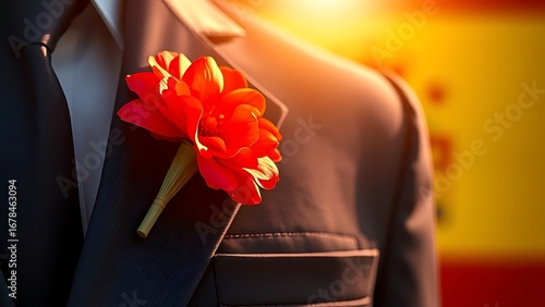 Red carnation on navy blue blazer, golden sunlight reflecting with blurred Spanish flag colors.