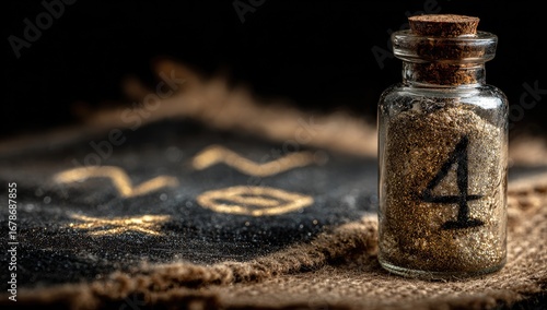 Small glass bottle with gold-colored sand and a numeral "4" on dark cloth