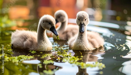 Three fluffy cygnets on a pond