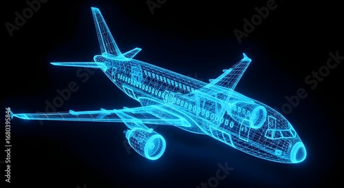 Blue wireframe airplane viewed from the front against a black background aircraft