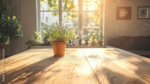 Minimalist wooden table in a sunlit room, offering a simple and peaceful setting for relaxation or work.