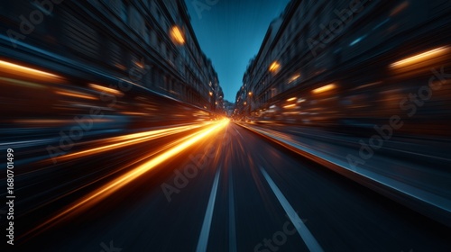 Cityscape at Speed: A captivating, blurred view down a city street at night, showcasing a sense of rapid movement.