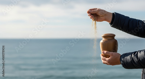 Scattering ashes during memorial service, small urn being used at sea, with hands releasing remains into ocean. Scattering ashes into calm water is a ritual, a way to say a last goodbye to loved one,