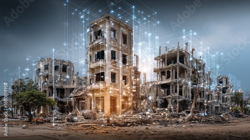 Damaged buildings in a post-disaster scene, overlaid with digital reconstruction elements, depicting a potential use for technology in disaster recovery.