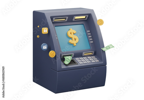 Isolated rendering of an ATM machine showing money being withdrawn for cash transactions