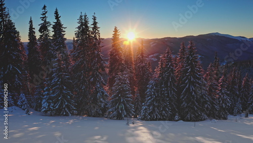Majestic aerial drone view of sunset snowy mountain forest with tall pine trees covered with fresh snow illuminated by setting sun in winter Carpathian mountains. Winter wild nature travel background