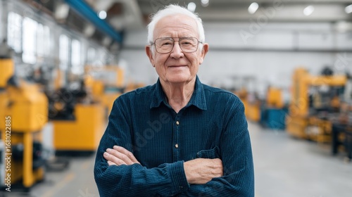 Smiling Elderly Man in Blue Shirt with Arms Crossed in Industrial Workshop with Modern Equipment and Yellow Machines in the Background