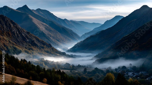 A stunning autumn view of the mountains bathed in goden light, with morning fo slowly dispersing over th valley.
