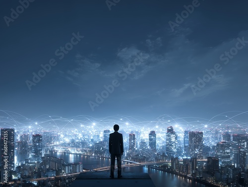未来都市を見下ろすスーツ姿のビジネスマンとネットワーク