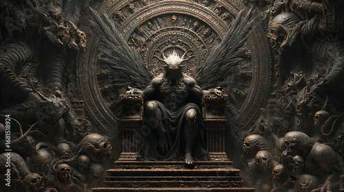A formidable demon king sits enthroned amidst a macabre tableau of skulls, radiating an aura of darkness, evil, and gothic horror in a nightmarish fantasy realm
