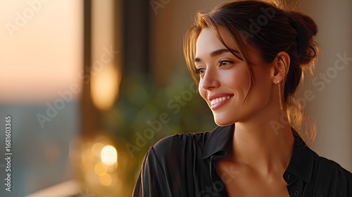 Portrait of a Happy Young Woman Smiling Naturally Indoors During a Beautiful Sunset