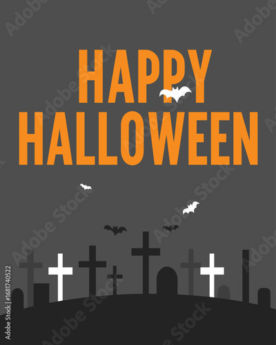 A festive Happy Halloween greeting features orange text, flying bats, and a spooky graveyard silhouette.