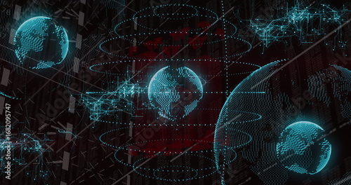 Floating blue holographic Earth over red matrix with orbital rings and data nodes, copy space