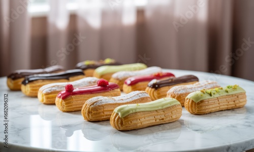 Assorted pastries, likely ?clairs, arranged on a round marble surface, with a soft background of sheer curtains