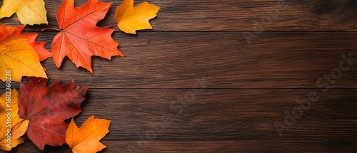 Autumn leaves scattered on wooden table, cozy Thanksgiving dinner invitation background