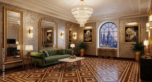 Exquisite art deco living room with city views bathed in soft light and luxury details