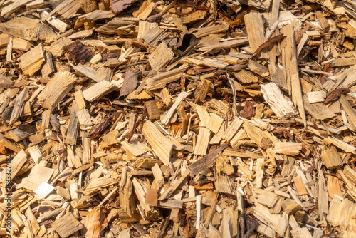Close-up texture of wood chips for biomass fuel, mulch, and sustainable energy production, natural wooden background in brown tones