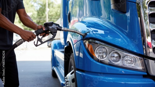 Fueling a blue semitruck at a gas station, showcasing the transportation industry, energy sector, and the essential service of diesel fuel
