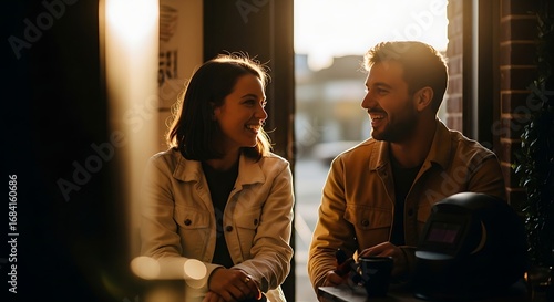 person in light jacket smiling couple enjoying conversation warm golden