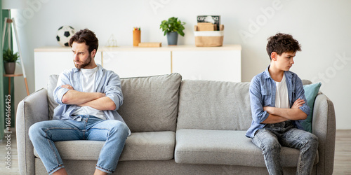 Family generations conflict. Offended fatherand son sitting on different sides of the couch, ignoring each other after argue. Stubborn dad and boy don't looking and speaking after conflict