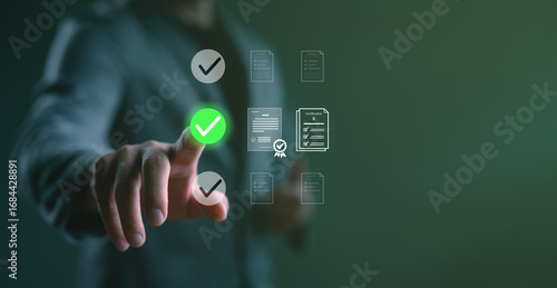 Businessman validating digital documents with green check mark symbol. Concept of certification, approval process and digital verification in business or compliance operations.