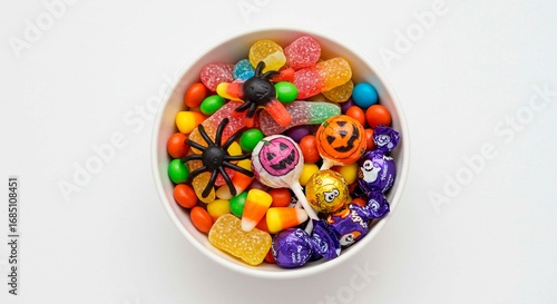 A top down view of a white bowl filled with halloween candy including lollipops and candy corn treats