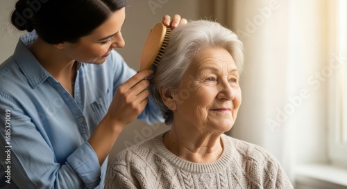 Caring caregiver brushing the hair of a smiling elderly woman by a window